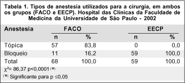 Em aproximadamente 84% dos indivíduos do grupo FACO, a cirurgia foi realizada com anestesia tópica, em virtude da concordância entre a avaliação da equipe cirúrgica e a aceitação do paciente; nos demais casos, foi utilizado bloqueio peribulbar (Tabela 1). Em todos os sujeitos do grupo EECP, foi utilizado bloqueio peribulbar, devido à maior manipulação intra-ocular, principalmente da íris e ao mais prolongado tempo cirúrgico, fatores que, segundo alguns autores contra-indicam a utilização da anestesia tópica(46-50).