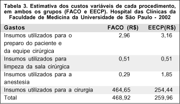 Os gastos estimados com os insumos utilizados para as cirurgias (custos variáveis), em ambos os grupos (FACO e EECP), foram de R$ 468,92 no grupo FACO e R$ 259,96 no grupo EECP, a diferença de R$ 208,96 reflete despesas com materiais mais dispendiosos, utilizados para as cirurgias no grupo FACO. Os gastos com os insumos para a cirurgia aumentaram cerca de 80% quando a técnica de FACO foi utilizada (Tabela 3). A possível diminuição das despesas com insumos e materiais descartáveis, quando comparadas com outros hospitais e clínicas, deve-se a medidas, como aquisição de materiais em concorrência pública em grandes quantidades e o uso máximo de insumos (colírios e substâncias anestésicas são utilizados em mais de um procedimento).
