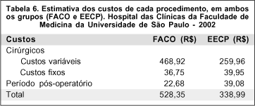 No tocante ao acompanhamento pós-operatório, estimou-se que a despesa do HCFMUSP com cada consulta de retorno foi de aproximadamente R$ 7,66 (Tabela 5). Considerando-se que o grupo FACO necessitou, em média, de 3 retornos pós-operatórios e o grupo EECP, em média, de 5,17 retornos, infere-se que as despesas hospitalares com o acompanhamento pós-operatório sejam, em média, R$ 16,40 (42%), menores no grupo FACO.