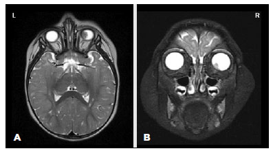 An 18-month-old girl referred for evaluation of leukocoria of the left eye (OS) was submitted for ocular examination under anesthesia, brain and orbital magnetic resonance imaging (MRI), and a full physical exam by a pediatric oncologist. Under anesthesia, intraocular pressure and anterior segment were examined, and indirect ophthalmoscopy was performed. Documentation was provided with anterior segment and fundus drawings, fundus photography, posterior segment optical coherence tomography, and full-field ERG. OS showed an inferonasal solid white retinal tumor with prominent vasculature associated with an avascular dense cloud in the vitreous and prominent vitreous seeding extending to the posterior surface of the lens. MRI revealed that the tumor did not involve the optic nerve (Figure 1), and the physical exam was normal. The child was diagnosed with a group D unilateral retinoblastoma, according to International Classification for Intraocular Retinoblastoma.