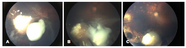 The chosen treatment was single-agent intraarterial chemotherapy (IAC) with melphalan 4 mg (0.4 mg/kg)(7). Four weeks later, the tumor regressed minimally, and treatment was switched to intravenous chemotherapy (IVC). The planned treatment (Brazilian protocol) consisted of six monthly cycles of IVC (vincristine, etoposide, and carboplatin) and tumor consolidation with cryotherapy. Substantial tumor shrinkage was observed after the first IVC cycle that was associated with vitreous traction, an inferonasal retinal tear, and nasal retinal detachment. Cryotherapy and laser photocoagulation were promptly performed to prevent retinal detachment progression (Figure 2A). Two months later, the retina was reattached, but there were still residual active vitreous seeds (Figure 2B), prompting additional six months of intravitreous melphalan (IVM) 30 mcg (vitreous melphalan concentration of 8 µg/ml).