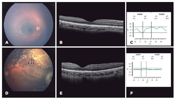 ERG was performed following ISCEV recommendations(8) and showed a decrease in amplitudes of a- and b-waves in the photopic phase (3.0 cd.s/m2) (Figure 3F). Light-adapted 3 ERG recordings of retinal responses were also obtained in both eyes before 10 minutes at the light with RETevalTM device and skin electrode. The skin electrodes impedance was less than 5 kΏ. The pupil diameter was 8.8 mm in the right eye and 9.3 mm in the left eye. In the right eye, light-adapted 3 ERG showed the a-wave amplitude of -9.7 µV and pike-time of 9.5 ms and b-wave amplitude of 19.6 µV and pike-time of 42.7 ms. In the left eye, light-adapted 3 ERG showed the a-wave amplitude of -1.3 µV and pike-time of 11.5 ms and b-wave amplitude of 5.3 µV and pike-time of 34.2 ms.