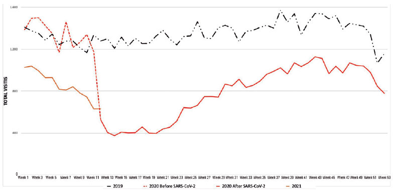 Previous studies reported significant changes in the number of ophthalmology emergency visits in different countries, such as Italy(2,3), Canada(4), and Israel(5). However, there is a lack of data on long-term follow-up of the COVID-19 impact on health care, especially in countries that still face dramatic COVID-19 infection rates in 2021, such as Brazil.