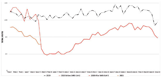 During the pandemic (March 17, 2020, to March 17, 2021), the hospital registered a total of 41,791 visits with a mean of 114.18 ± 43.12 visits per day (range 27-214), and in the prepandemic group (March 16, 2019, to March 16, 2020), there were 71,485 visits with a mean of 194.78 ± 49.74 visits per day (range 71-307). The total visit number decreased by 41.4% from the prepandemic to the pandemic period, and the month with the lowest number of patient visits was in April 2020, with a mean of 59.03 visits per day.