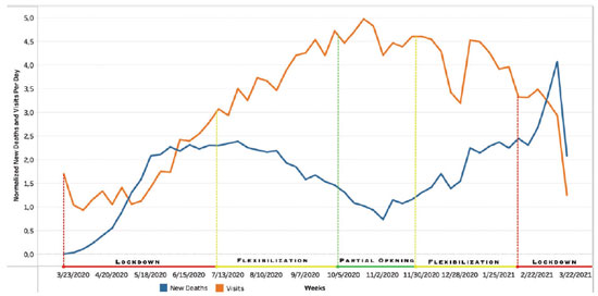 During the first lockdown phase, the emergency visits abruptly reduced, and the number of deaths increased. Even before the flexible period, the deaths related to COVID-19 progressively decreased and the visits increased until November 2, 2020. In the next phase, the deaths increased, and emergency visits progressively decreased.