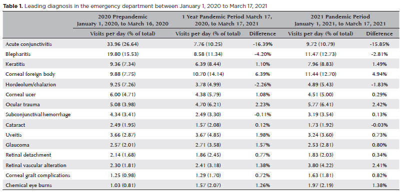Methods: An observational, retrospective study was conducted that included all patients admitted to the Ophthalmology Emergency Department between January 1, 2019, and March 28, 2021. The visits were classified into prepandemic and pandemic groups that were then compared.