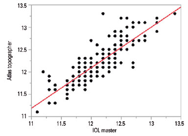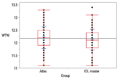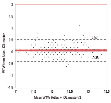 The importance of accurately measuring the WTW distance is well acknowledged. In the past, the WTW distance was mainly used for the diagnosis of congenital glaucoma and micro- or megalocornea; however, recently it has also become relevant in the planning of cataract surgery, as the newer generation formulas, such as Holladay 2, Hill-RBF, Olsen and Barrett Universal II, recommend use of the WTW distance as an input variable(1,2). It is also imperative for selecting the correct size of an anterior chamber or sulcus-implanted IOL(4,5). However, despite many instruments that can measure it, a thorough review has shown that the accuracy and interchangeability of these instruments remains questionable and neither can be used as the gold standard(7). The results of this study showed that the IOL Master and Atlas topographer may be interchangeable with respect to WTW distance measurements.