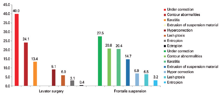 Figure 2 demonstrates the postoperative complications for severe ptosis. Undercorrection was reported to be the most common complication for aponeurosis resection (40%) or frontalis suspension technique (27.5%).