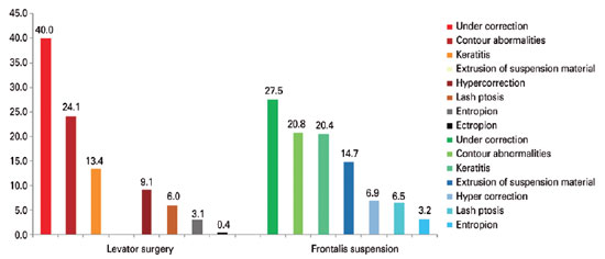Complications after severe ptosis surgery depend on the surgical technique. In our survey, aponeurotic procedures or frontalis suspension were the most likely to result in an undercorrection, but variations in the technique might have influenced the outcome(43,44).