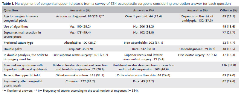 Resultados: Trezentos e cinquenta e quatro experientes cirurgiões oculoplásticos dos quais 47,7% realizam mais de 20 cirurgias de ptose da pálpebra superior por ano responderam ao questionário. Na avaliação pré-operatória, 68,9% realizam testes para olho seco, mas o teste da fenilefrina é feito por menos da metade dos entrevistados (47,4%). A ptose da pálpebra superior leve geralmente é corrigida por conjuntivo-mullerectomia (43,6%), a ptose da pálpebra superior grave por cirurgia do músculo frontal (57%) ou ressecção da aponeurose do levantador via anterior, principalmente usando a supramáxima (17,5%). O principal motivo para operar a ptose congênita grave é o risco de ambliopia (37,3%). A ptose involucional associada à dermatocálase costuma ser corrigida pela via anterior (63,3%). Hipocorreção é complicação comum após a ressecção da aponeurose do levantador (40%) ou suspensão ao frontal (27,5%).
