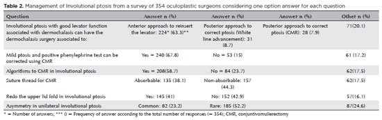 Métodos: Os membros das referidas sociedades foram convidados por e-mail para responder a um questionário eletrônico garantindo o anonimato. O questionário constou de dados demográficos do cirurgião e outras quatro seções: avaliação pré-operatória da ptose da pálpebra superior, preferências cirúrgicas, conduta pós-operatória e complicações. Estatística descritiva foi utilizada para análise da frequência e proporções percentuais.