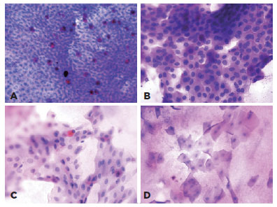 The eyes of the patient were topically anesthetized to perform the impression cytology of the conjunctiva. Small disks of cellulose acetate filter paper (MFS; Advantec MFS, Pleasanton, CA, USA; pore size = 0.2 µm) were sliced into approximately 4 × 5-mm pieces, placed on the superior nasal bulbar conjunctiva at a distance of 5 mm from the limbus, gently pressed for 5 s, and subsequently removed. The specimens were placed in a 96% ethanol solution and stained with periodic acid Schiff stain, as described previously(14). Periodic acid Schiff-stained conjunctival impression cytologic specimens were examined blindly by a pathologist (B.P.) and graded according to the Nelson scoring system based on the morphology of the epithelial cells and the number of goblet cells (Figure 1)(14). The number of goblet cells per mm2 (approximately 4 high-power fields) was recorded. Moreover, the numbers of neutrophils and lymphocytes were counted in a high-power field.