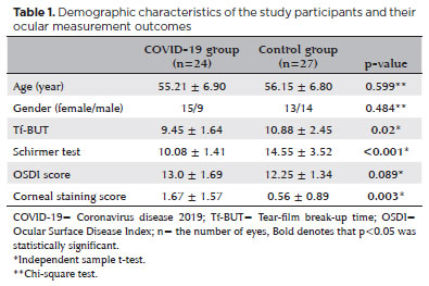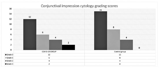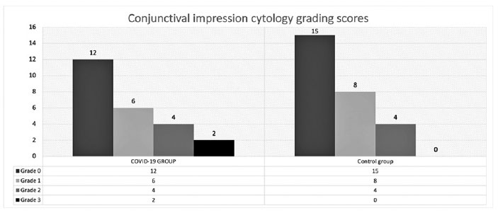 Resultados: Concluiu-se que não houve diferença significativa em relação ao gênero e idade média entre os dois grupos (p=0,484 e p=0,599, respectivamente). A análise dos resultados da citologia de impressão da conjuntiva revelou que a densidade das células do cálice diminuiu, enquanto os linfócitos e neutrófilos aumentaram nos pacientes do grupo COVID-19 quando comparados com os do grupo controle. Quando a classificação de Nelson foi aplicada às amostras de citologia de impressão da conjuntiva, determinou-se que 25% dos pacientes do grupo COVID-19 e 14,8% dos pacientes do grupo controle apresentaram alterações consistentes com grau 2 ou superior. O tempo médio de separação do filme lacrimal, teste de Schirmer e os resultados das pontuações de coloração da córnea foram determinados, diferindo entre o grupo COVID-19 e o grupo controle (p=0,02, p<0,001, and p=0,003, respectivamente).