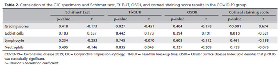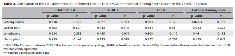 In the present study, the OSDI questionnaire-a quick method to evaluate symptoms related to dry eye-was applied to determine the presence of subclinical ocular findings. In their study, Hong et al. administered the OSDI questionnaire via phone calls to 56 patients after discharge(21). The authors reported that the complaints of patients with pre-coronavirus dry eye symptoms increased and that patients without symptoms developed dry eye symptoms after getting infected. Although this finding supports the hypothesis that dry eye disease is a complication of COVID-19, longitudinal studies are warranted to monitor the changes in OSDI during and after the disease up to several months of the recovery period. Significantly lower Schirmer test and tear-film break-up time scores and significantly higher corneal staining scores were recorded in the COVID-19 group, with significant correlations noted among conjunctival impression cytological grading scores, tear-film break-up time, and corneal staining scores. A strong negative correlation was noted between the corneal staining scores and the number of goblet cells. Although these correlations suggested that impression cytology is a sensitive method for identifying dry eye disease in COVID-19, unfortunately, no significant difference was noted between the COVID-19 and control groups in terms of the mean number of goblet cells per mm2 and the Nelson grades despite the higher frequency of grade 2 cases in the COVID-19 group and the lack of grade 3 cases in the control group. Although this finding can most likely be attributed to the small number of subjects, it may also reflect the limited diagnostic value of impression cytology in this particular patient group. Previously, it was reported that the Schirmer test and tear-film break-up time decreases significantly despite normal grading scores and goblet cells in non-COVID-19 diseases, implying a higher sensitivity(22,23). Whether this notion also applies to COVID-19 warrants further investigation.
