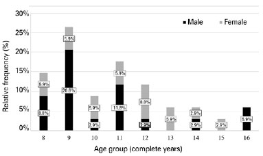 The final sample included 68 eyes of 34 patients who did not present any abnormalities in the biomicroscopic examination and corneal tomography. Figure 1 presents the sample’s gender and age distribution. The mean age was 10.76 ± 2.31 years, ranging from 8 to 16 years, and male participants represented 55.9% of those evaluated.