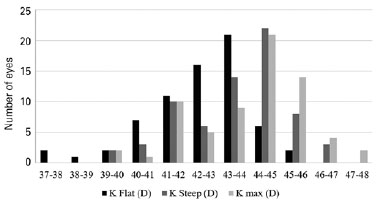 Figure 2 summarizes the keratometry data of the 68 eyes analyzed. Kflat, Ksteep and Kmax in diopters (D) were 42.37 ± 1.63 (range: 37.07-45.43), 43.53 ± 1.65 (range: 39.17-46.52), and 43.90 ± 1.73 (range: 39.60-47.63), respectively.