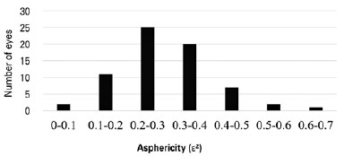 The observed asphericity was 0.28 ± 0.11 (range: 0.03-0.61), with 66.2% of the evaluated eyes having values between 0.2 and 0.4 (Figure 3).