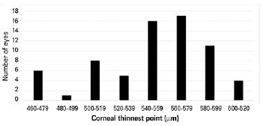 The mean CTP was found to be 550.20 ± 37.90 μm in the analysis of corneal thinnest point (range: 462-612). It was observed that 64.7% of the patients were between 540 and 599 μm (Figure 4).