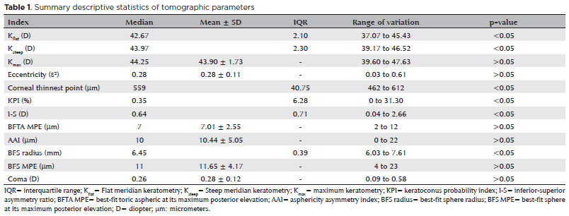 Kmax, ε2, BFTA MPE, AAI, BFS MPE, and coma variables were normally distributed. Kflat, Ksteep, CTP, KPI, I-S, and BFS radius were non-normally distributed and represented by median and IQR.