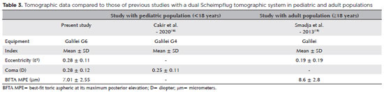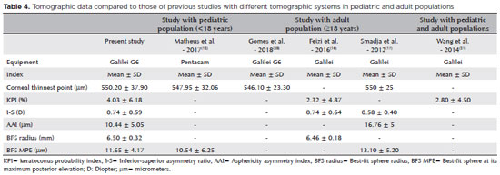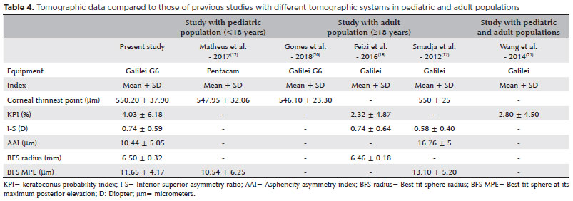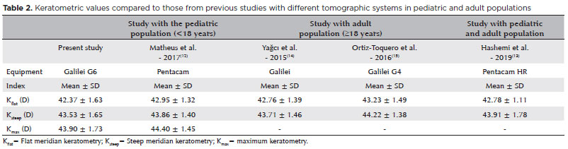 Keratometric parameters (Kflat, Ksteep, and Kmax) were similar to those reported in previous studies in pediatric(12,13) and adult populations(14,15) using different tomographic systems (Table 2). When compared to the adult population, our values are lower, which is in accordance with the literature, considering that keratometric values tend to increase with age and go through changes due to genetic and environmental conditions(23,24).