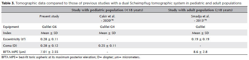 The elevation indices BFS and BFTA cannot be used interchangeably. BFS MPE values were determined to be within normality and in agreement with the study conducted in an adult population by Smadja et al.(19) (Table 4). The values considered normal were <14 μm, which can help distinguish between corneas with unspecific topographic irregularities and those with subclinical keratoconus.