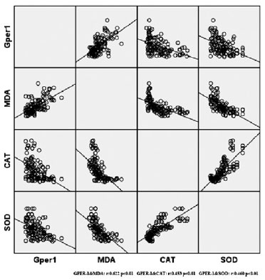 In the correlation analysis between GPER-1 and oxidant/antioxidant levels, GPER-1 correlated positively with MDA and negatively with SOD and CAT (r=0.622/p<0.01, r=0.453/p<0.01, r=0.460/p<0.01, respectively) (Figure 1).