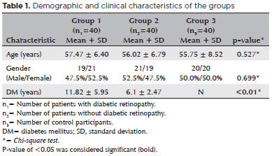Groups 1, 2, and 3 each included 80 patients. Table 1 presents the demographic data for the groups and information concerning the duration of diabetes. No significant differences were found between the groups in terms of age or sex (p=0.527, p=0.699, respectively). However, a significant difference was found for diabetes duration (p<0.01), and the DR group had the longest diabetes duration.