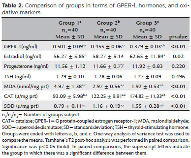 A significant difference was also found among all groups in terms of serum GPER-1, MDA, CAT, SOD, and estradiol (p<0.01), but no significant difference was observed among the groups in terms of progesterone and TSH (p=0.496, p=0.220, respectively). In the post-hoc analysis of parameters showing significant differences, a significant difference was found between GPER-1, MDA, CAT, and SOD in all groups, and a significant difference for estradiol was determined between Group 1 and Group 3 (p<0.01) (Table 2).