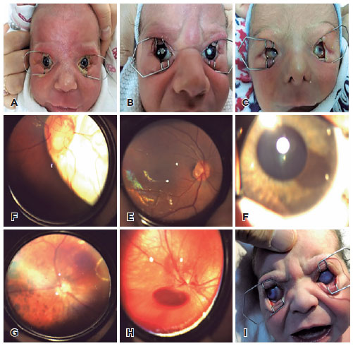 As listed in Table 1, the other abnormalities included subconjunctival hemorrhage, isolated bilateral iris coloboma (Figure 3A), congenital cataracts (Figure 3B), microphthalmia (Figure 3C), optic disc-choroidal coloboma (Figure 3D), optic disc pathologies (Figure 3E), iris nevus (Figure 3F), choroidal nevus (Figure 3G), vitreous hemorrhage (Figure 3H), buphthalmos with an intraocular pressure of 40 mmHg (Figure 3I), non-specific retinal pigmentary changes, posterior synechia, corneal opacity, and anophthalmus.
