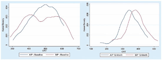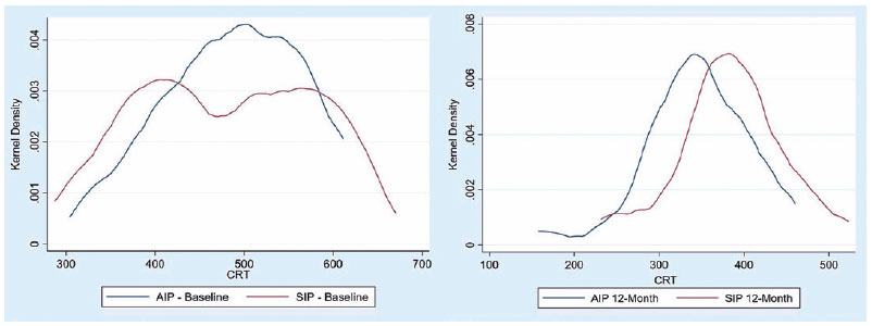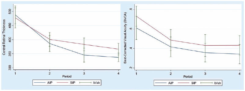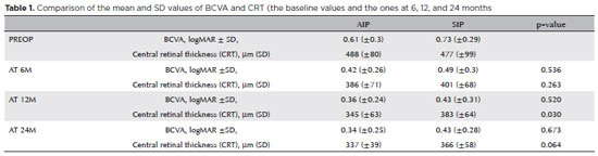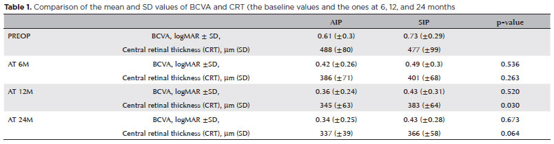 Table 1 includes two-sample t-test results to check if there is a statistically significant difference in the improvements observed in both groups. The changes in BCVA observed in both groups were not statistically significant (p=0.54, p=0.52, p=0.67) at each period of observation. In terms of CRT, no statistically significant differences were observed at 6 months (p=0.26) or 24 months (p=0.06), but they were statistically different at 12 months (p=0.03), indicating potentially more favorable results for AIP after one year of the operation. The graphical representation also indicates that CRT values in the AIP group fall at a higher rate than the CRT values in the SIP group (Figure 2). As demonstrated in the Figure, there are no obvious differences in the pattern of BCVA values of both comparison groups.