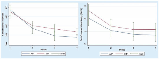 The primary outcome measure was the mean change in BCVA and CRT at a 6-month follow-up for each group. The secondary outcome measures included the mean change for each treatment group in the BCVA change at 12 and 24 months and the change in CRT by the SD-OCT at 12 and 24 months. CRT was defined as the highest value on the standard Spectralis SD-OCT retinal thickness map.