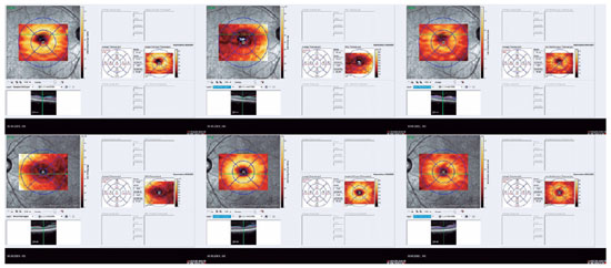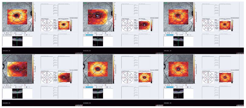 The patient did not have any symptoms of increased intracranial pressure. There were no clinical signs of optic nerve involvement, papilledema, or diabetic retinopathy in both eyes. Interestingly, our patient was initially diagnosed after the visualization of unilateral retinal GCC thinning on OCT.