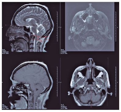 Brain MRI (Figure 2) revealed herniated cerebellar tonsils, approximately 11 mm from the foramen magnum to the inferior. The condition was not accompanied by hydrocephalus, space-occupying lesions, and cerebral venous thromboses. The finding was consistent with CMI.
