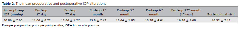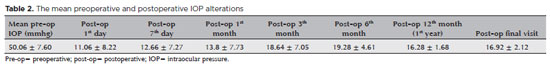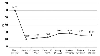 In the preoperative period, the patients’ mean IOP was 50.06 ± 7.60 mmHg. The mean IOP at 1 day, 7 days, and 1, 3, 6, 12 months, and final visit was 11.06 ± 8.22, 12.66 ± 7.27, 13.8 ± 7.73, 18.64 ± 7.05, 19.28 ± 4.61, 16.28 ± 1.68, and 16.92 ± 2.12 mmHg respectively (p=0.001 for every follow-up visit) (Table 2, Figure 3).