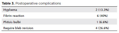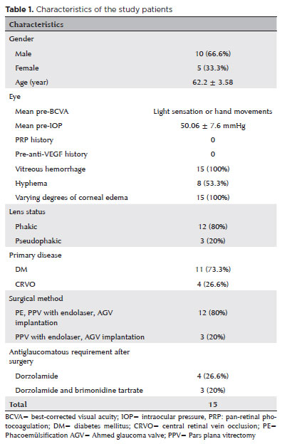 The study comprised 15 eyes (7 right, 8 left) from 15 patients with neovascular glaucoma, diagnosed as a complication of diabetic retinopathy in 11 cases and as a result of ischemic central retinal vein occlusion in 4 patients. Ten of the subjects were men and 5 women. The mean age of the patients was 62.2 ± 3.58 years. The mean follow-up was 24.4 ± 14.56 months. All cases had a vitreous hemorrhage, and 8 patients were accompanied by hyphema. Corneal edema of varying degrees was present in all cases due to increased IOP (Table 1).