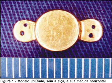1) Ímãs de terra rara (neodímio, ferro e boro) recobertos com níquel, medindo 5 mm de diâmetro por 2,5 mm de altura, foram envolvidos por duas chapas de ouro maciças, uma de 10 micrômetros, envolvendo a parte anterior do ímã, e outra medindo 35 micrômetros, desde a base do ímã até o ápice, encontrando, então, a chapa de 10 micrômetros da face anterior. O implante (complexo formado pelo ímã e as duas chapas em ouro e a alça de fio monofilamentar inabsorvível para a dinamometria) mediu 13,0 mm horizontalmente e 3,0 mm verticalmente, sendo elaborado artesanalmente em um serviço privado e sempre pela mesma pessoa (figura 1);