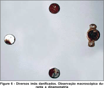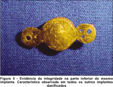 Observou-se clinicamente, na retirada do implante, ruptura superior, no encontro das chapa inferior e superior de ouro, em cinco (9,3%) das 54 órbitas. Apesar disso, somente em duas órbitas a secreção purulenta fez-se presente (todas pertencentes ao subgrupo F-6 (fio, seis semanas). É possível que tal fenômeno (ruptura superior dos implantes) se deva a pequenos defeitos no momento de aproximar as duas chapas (a inferior com a superior), na parte superior do ímã, ainda que tenham sido elaboradas pela mesma pessoa (figuras 4, 5 e 6). Estudos no Laboratório de Química da Universidade de São Paulo, sobre implantes danificados, demonstraram que a concentração de ouro foi de 94,5%. (figuras 4, 5 e 6).