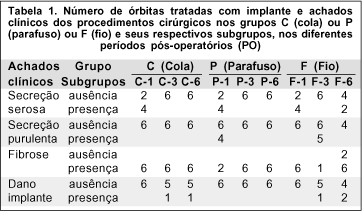 1) Sinais clínicos de reação inflamatória do implante e sua fixação foram observados com cianoacrilato ou parafuso ou sutura inabsorvível (Mersilene 5.0®) até a sexta semana pós-operatória, sendo mais intensa no grupo F (fio), já que das cinco órbitas tratadas com implante e que apresentaram danos, três pertenciam a este grupo, sendo que duas destas apresentaram secreção purulenta que creditamos à ruptura do implante na sua parte superior. É provável que o fator tempo seja responsável pela não observação de reação inflamatória purulenta em dois dos três implantes que estavam danificados visto que nestes a avaliação ocorreu na terceira semana pós-operatória.
