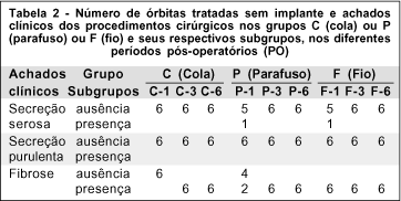 Comparando-se as órbitas tratadas com implante e tratadas sem implante, nos seus respectivos subgrupos C-6, P-6 e F-6, não se observou diferença estatisticamente significante quanto às secreções serosa, purulenta e fibrose (presente em todas as órbitas desse período). Na comparação entre as órbitas tratadas com implante (C-6 e P-6; C-6 e F-6; P-6 e F-6), não se observou, também, nível de significância quanto às secreções serosa, purulenta e fibrótica. Das 18 órbitas tratadas, em três delas os implantes não estavam íntegros, no momento da abertura para retirada dos tecidos, para o estudo histológico, nos subgrupos C-6 (cola), coelha 37, F-6 (fio), o animal 47 e, no subgrupo F-6, o animal 48. Nos dois últimos casos, observou-se a presença de secreção purulenta.
