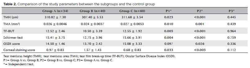 For the subgroup analysis, Group B had significantly lower mean TMH, TMA, TF-BUT, and Schirmer test scores but had significantly higher corneal staining scores than Groups A and C (Table 2).