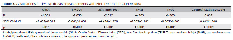 All statistical data were analyzed using IBM SPSS Statistics for Windows 22.0 (IBM Corp., Armonk, NY, USA). We used the chi-square test to compare the categorical values, Kolmogorov-Smirnov test to assess the normal distribution of the variables, and the 2-sample t-test to compare the independent variables. Any relationship between the quantitative results was investigated by Pearson correlation analysis. To search for associations between MPH treatment and tear measurements, we used the generalized linear models (GLM). A separate GLM was created for each DED test as a dependent factor. The GLM results were obtained with correlation coefficients (B), lower and upper bounds of 95% Wald confidence interval, and p-values. A p-value of less than 0.05 was considered statistically significant.
