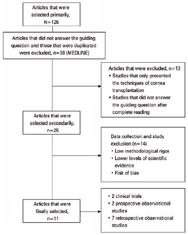 In the second stage of selection, we performed a complete reading of the 38 articles. Subsequently, the researchers had a meeting and discussion, and only 25 studies were selected. Studies that only presented the corneal transplantation techniques and those that did not answer the guiding question after the whole reading were excluded.