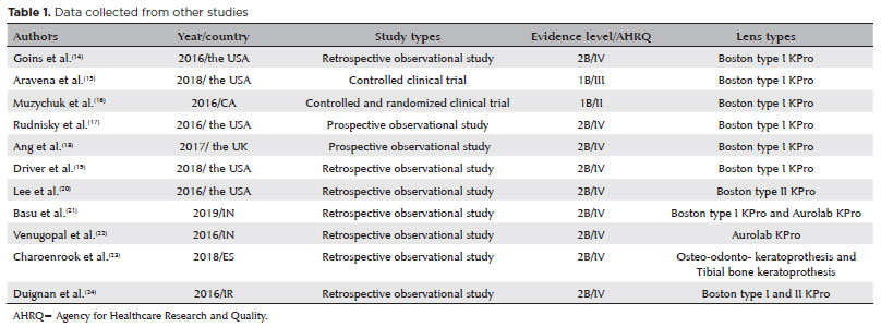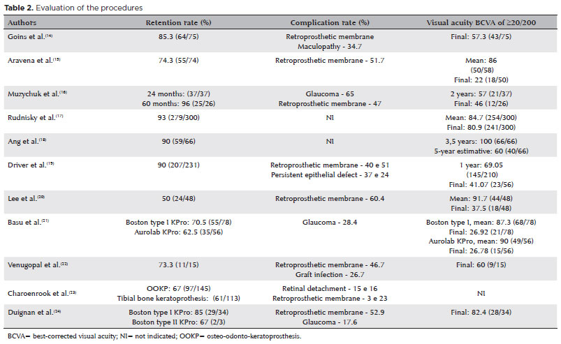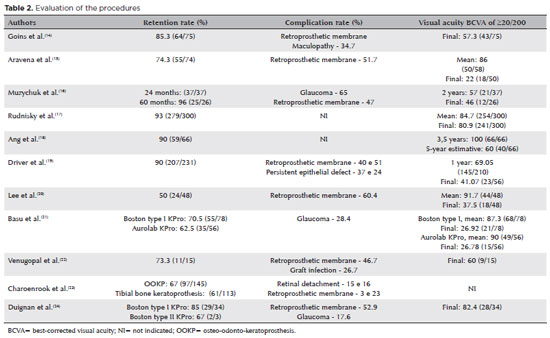 Six articles were published in 2016(14,16,17,20,22,24), one in 2017(18), three in 2018(15,19,22), and one in 2019(21). All articles analyzed the use of artificial corneal keratoplasty. Table 1 depicts the information collected. In addition, assessment was performed using data on retention, complications, and VA (Table 2).
