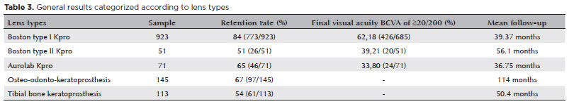 The articles analyzed (n=11) included 1256 eyes and 1303 procedures. Among them, 923 utilized the BKPro I; 51, the BKPro II; 71, the Auro KPro; 145, the OOKP; and 113, the tibial bone keratoprosthesis. The mean follow-up time ranged from 9.65 to 114 months. The corneas used were either fresh or frozen(16). The mean age of the patients ranged from 43 to 71 years, and majority were men. Visual rehabilitation was evaluated by analyzing different variables (Table 2), and the results are shown in table 3. Although it was necessary to convert corrected-distance VA (CDVA) to BCVA, one article did not have any data about BCVA(25). Next, data were combined according to lens type to facilitate comparison. The percentages reported refer to the number of patients who obtained the expected outcomes during the study. However, one article did not report the mean or final VA of the patients. Hence, studies that used osteo-odonto-keratoprosthesis and tibial bone keratoprosthesis were not analyzed(24).