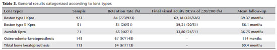 The OOKP is a device built from the patient’s tooth, and it acts both as a biological tissue and artificial structure(23). It was developed in 1963 by Strampelli(34) and later modified by Falcinell(35,36). The procedure is complex, and it occurs in two stages, with a long operative period. Follow-up is a lifelong process in patients with this device, and patients must be committed to continuous postoperative care and periodic consultations. OOKP is indicated for eyes with severe dryness, with no eyelids or blinking due to damaged ocular surfaces. Thus, it can help in the recovery of a sustainable VA(37). The current review did not assess the final VA of this lens because the necessary information was not available in the study. However, it had a median maximum VA of 20/250 in 18% of cases and a follow-up of over 114 months(23). In a study of OOKP in patients with severe chemical and thermal burns, the authors showed that the final VA of 43% (6/14) of patients with 5 years was 20/200, and the retention rate was 85% (11/14)(38). By contrast, in our study, the retention rate was only 67% (97/145). The most common complications were RPM, glaucoma, and retinal detachment. However, according to Afonso et al., glaucoma was the most prevalent.