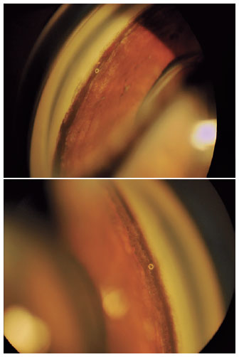 At presentation, she was examined by a uveitis specialist and a rheumatologist, and underwent an extensive laboratory workup to search for rheumatological and infectious causes. All results were normal, and no specific diagnosis was established. Nevertheless, she had IgG antibodies for the herpes simplex virus, varicella-zoster virus, and cytomegalovirus. BADI was suspected, as well as an unusual presentation of bilateral herpetic uveitis. She received oral aciclovir, acetazolamide, and prednisone, besides topical prednisolone, betaxolol, brimonidine, dorzolamide, and atropine bilaterally. After two months, topical corticosteroid was withdrawn, with resumption of symptoms. Prednisolone eye drops were reintroduced and gradually removed over the next two months, as well as all oral medications, with gradual resolution of the disease. Due to persistent ocular hypertension, she was referred to our Glaucoma Department in August 2019. Gonioscopy revealed, bilaterally, a wide and heavily pigmented angle 360°, and a gross pigment deposit in the inferior angle (Figure 2). On fundus examination, the optic discs were normal, with no signs of glaucomatous neuropathy. The IOP was controlled (16/18 mmHg) with three drugs (betaxolol, brimonidine, and dorzolamide). One year after the diagnosis, in April 2020, she developed bilateral cataracts. Combined cataract-iStent® surgery was proposed for both eyes and performed in May and June 2020. The purpose of iStent® implantation was to reduce at least one glaucoma medication. Surprisingly, it was possible to remove all hypotensive agents. At one year after surgery, the IOP was 11/12 mmHg without medication (Figure 3) and visual acuity was 20/15 in both eyes.