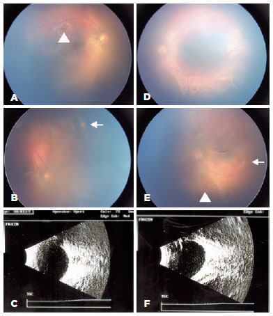 Figure 1. At presentation, color fundus pictures revealed vitreous opacities (gray vitreous hemorrhage) and retinal (arrow) and preretinal hemorrhages (arrowheads) (A, B). Ultrasound showed vitreous opacities corresponding to vitreous hemorrhage. (C, D).
