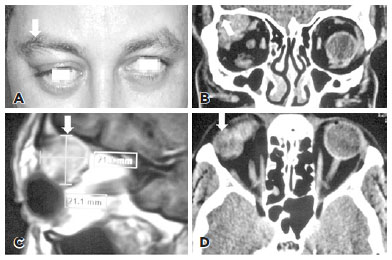 Though CT technique demonstrates an orbital isodense lesion in the superior lateral aspect of the orbit, magnetic resonance imaging (MRI) is a superior and a more valuable tool in the diagnosis of LGPA (Figure 2). Clarós et al. indicated that among the 52 cases they studied, MRI mostly showed lesions that were isointense to muscle on T1 (96.2%) and hyperintense to muscle on T2-weighted images(4,47) (94.2%). Further, only three cases (5.8%) showed infiltration of periorbital tissue(46).
