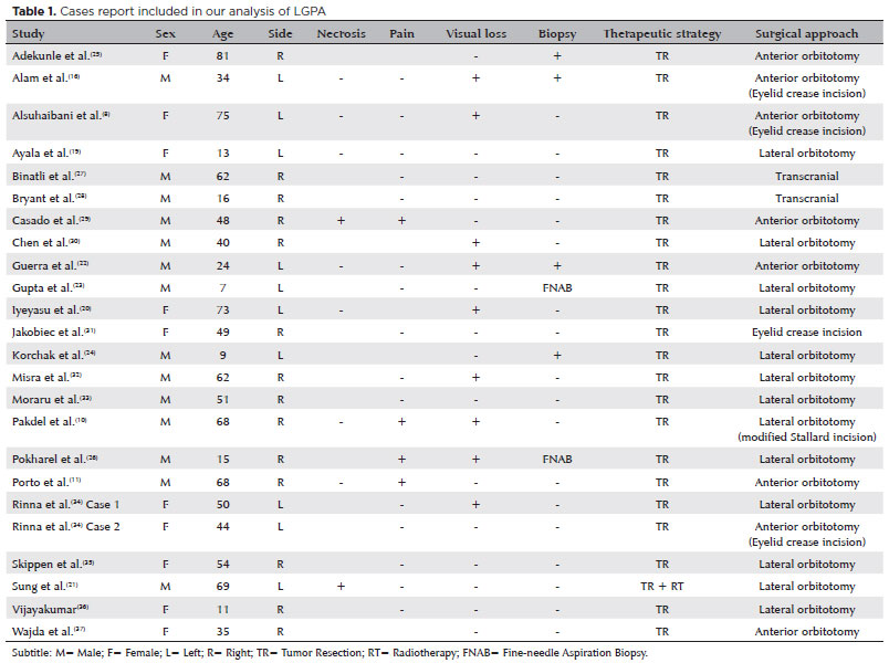 The LGPA is known to occur typically only on one side, with no apparent left or right predominance described. Although, in our study, the literature gathered indicated more occurrence of the right lacrimal gland LGPA (left [n=10], right [n=14]). All LGPA cases resolved through total excision, except for one which required the support of adjuvant radiotherapy, indicative of a malignant component(21). There were six case reports of preoperative incisional biopsy(16,22-26). The surgical approaches were varied (Figure 1), and the most frequently used was the lateral orbitotomy. The other methods were the anterior orbitotomy, or the transcranial approach(8,10,11,16,19-37).