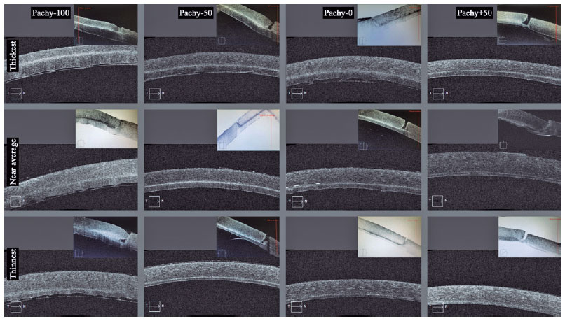 Accordingly, the overall thickest and thinnest lamellae were found in the Pachy-100 and Pachy+50 groups, respectively. The overall lamella thickness in the Pachy-100, Pachy-50, Pachy-0, and Pachy+50 groups measured 196 ± 54 µm (range, 123-273 µm), 129 ± 26 µm (range, 72-156 µm), 116 ± 29 µm (range, 64-165 µm) and 62 ± 31 µm (range, 31-107 µm), respectively. The multiple-group comparison revealed a significant difference among groups regarding central (p<0.001), paracentral (p<0.001), and peripheral lamella’s thickness (p<0.001). OCT images of the thickest and thinnest lamellae of each group, as well as the near-average lamellae, are shown in figure 1.